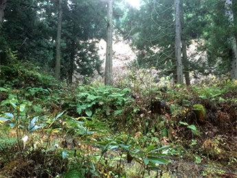秋田県由利本荘市から横手市方面へ向かう本荘街道(国道107号線)は豊かな自然に恵まれ、子吉川水系である石沢川が街道に沿って流れています。当社の山、「秋田実宝富士(あきたじっぽうふじ)」はその街道沿いにある山内の南に位置した奥名免沢(おくなめざわ)にあり、立ち並ぶ秋田杉が存在感を示しています。秋田実宝富士は春から初夏にかけてワラビやゼンマイなどが豊富に採れ山菜の宝庫となります。山菜が宝のように実ることから秋田実宝富士と名付けられました。