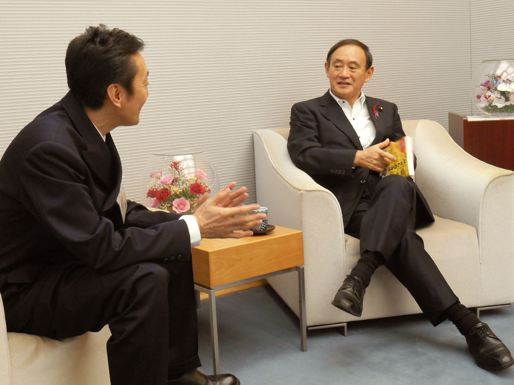 村上雅彦とじっくりと歓談下さいました。 菅官房長官は完成した書籍を私から直接受け取って下さいました。なんと私たちは首相官邸に招かれたのです。ちょうど私の母親が東京にいる日だったので親孝行をしたいと思い「母も連れて行っていいでしょうか?」とお願いをしてみたら二つ返事でご快諾を頂くことができました。少年時代、いわゆる不良であった私は親に迷惑のかけっぱなしでした。社会人となってからは仕事一筋で親孝行などした記憶がありません。母も一緒に首相官邸でお話しをさせて頂けたことで素晴らしい親孝行ができました。そして母にとってとても素晴らしい思い出となりました。感謝しております。そして、これを御縁に菅官房長官は私たちの開店にも駆けつけて下さるようになりました。尋常ではないお忙しさの中でのお心くばりに菅官房長官の人間性を感じます。