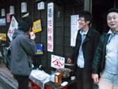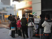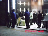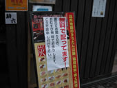 震災当日は停電になりました。電話もつながらず多くの情報源が断たれました。まさか、この様な大震災の始まりだという意識はまだありませんでした。そんな中、首都圏では交通網が麻痺し、帰宅難民の方々が駅前に溢れているという情報が入ってきました。当社の首都圏の店舗は駅前や繁華街にあります。最初にできた行動は、帰宅難民の方々をお店にご案内することでした。「帰宅手段のない方々は当店でお休みください。お店を無料で開放しております」という様な貼紙を各々の店で作成して店頭へ貼り、手が空いているスタッフは店頭で告知を行いました。多くの方々がご飯を召し上がっておりませんでしたので、豚汁などを各店の判断で無料でお配りすることが出来ました。